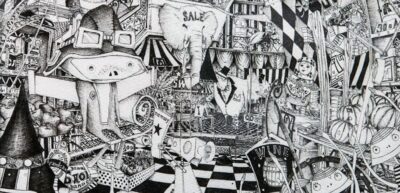 The sheer amount of stuff in each of Akihiro Nishino’s drawings is shocking. Done tirelessly with a .03mm pen, each picture has so much work put into it that you can stare at any given panel for half an hour without fully grasping everything that is happening inside it. When asked, Mr. Nishino noted that he goes through hundreds per pens per book, and that the best time for him to use a pen is when it is on its last legs and produces even finer lines than intended. Amazingly, like a high resolution photo, when blown up to several times their size, his work does not lose clarity and even looks better in a large format.