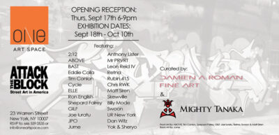 Damien A Roman Fine Art and One Art Space are pleased to present Attack the Block, a concise survey of contemporary street art in America, September 18 through October 10, 2015. This exhibition opens with a public reception for the artists Thursday, September 17, 6 – 9pm.