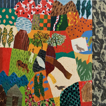 Educated in Korea, Hyun completed her art education in the US in the early 1970s. Merging her western art training and her eastern cultural heritage, she seamlessly fuses abstract and naturalistic painting. The subtle shifts throughout Hyun’s oeuvre link back to this binary approach to expressing a unifying vision. Subtle organic lines overlap carefully drafted grids that section the compositions into squares of space featuring the most delicate of marks. Contrasting these misty and ethereal pieces, Hyun’s works since 2017 employ strong, coarse lines that engulf the negative space around silhouetted figures or linear renditions of birds, animals, and sometimes houses. Also featuring collaged Korean texts and bold, bright colors, these compositions are strikingly different from the earlier work. However, Hyun’s immaculate application of her craft always conveys a clear sense and purpose: harmonious planes of shapes and colors repel discord and embrace completeness.