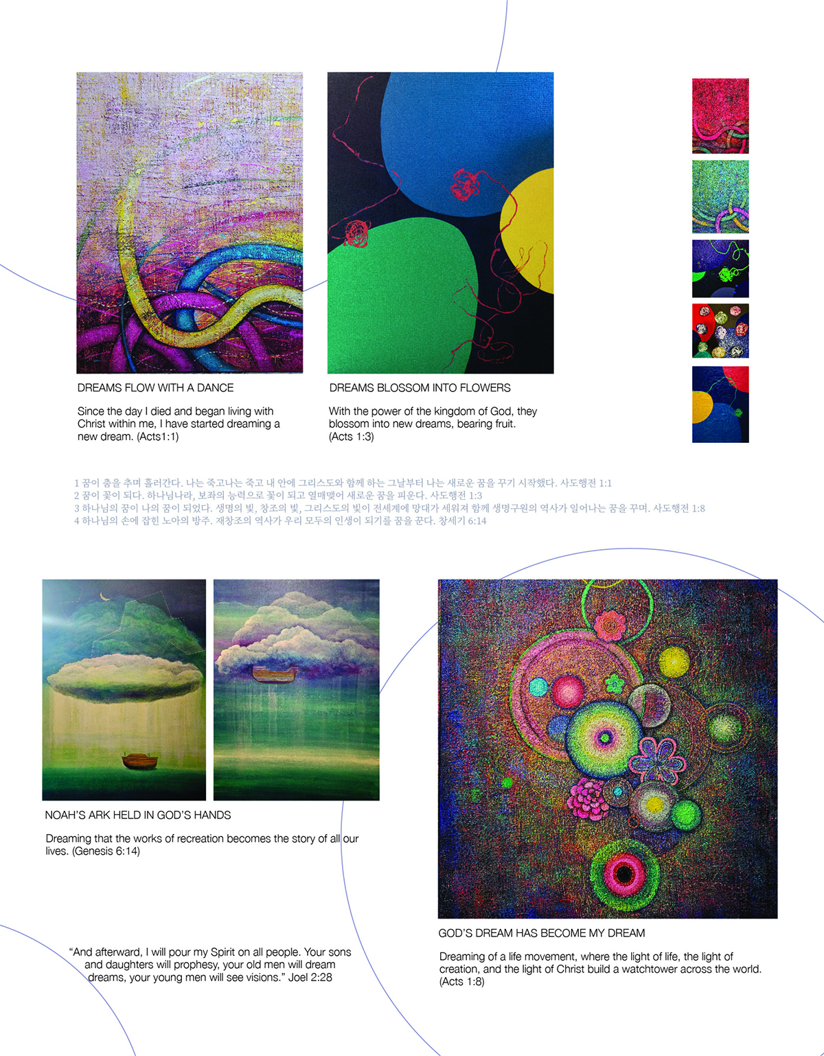 In her artist’s note, Namsook describes herself as a pilgrim of drawing, walking the path of a dreamer, aspiring to bring God’s kingdom into her art. She envisions her paintings as a conveyance of life, much like David’s stone in God’s hand, radiating light in this dark era.