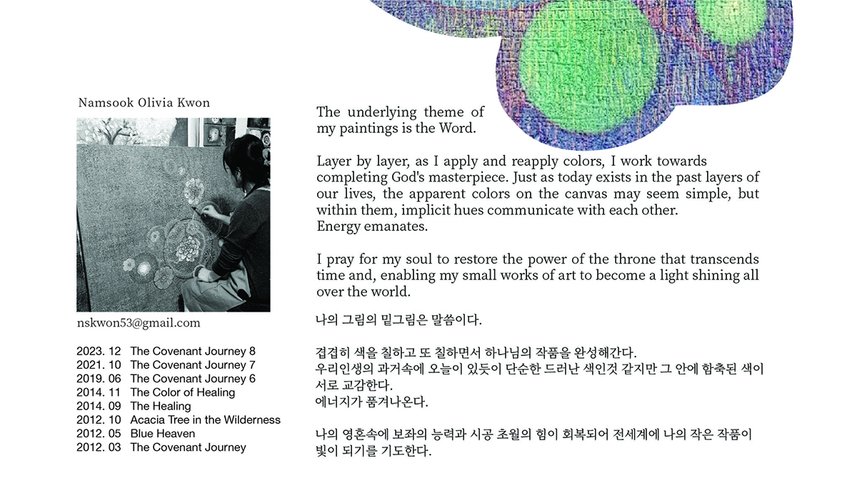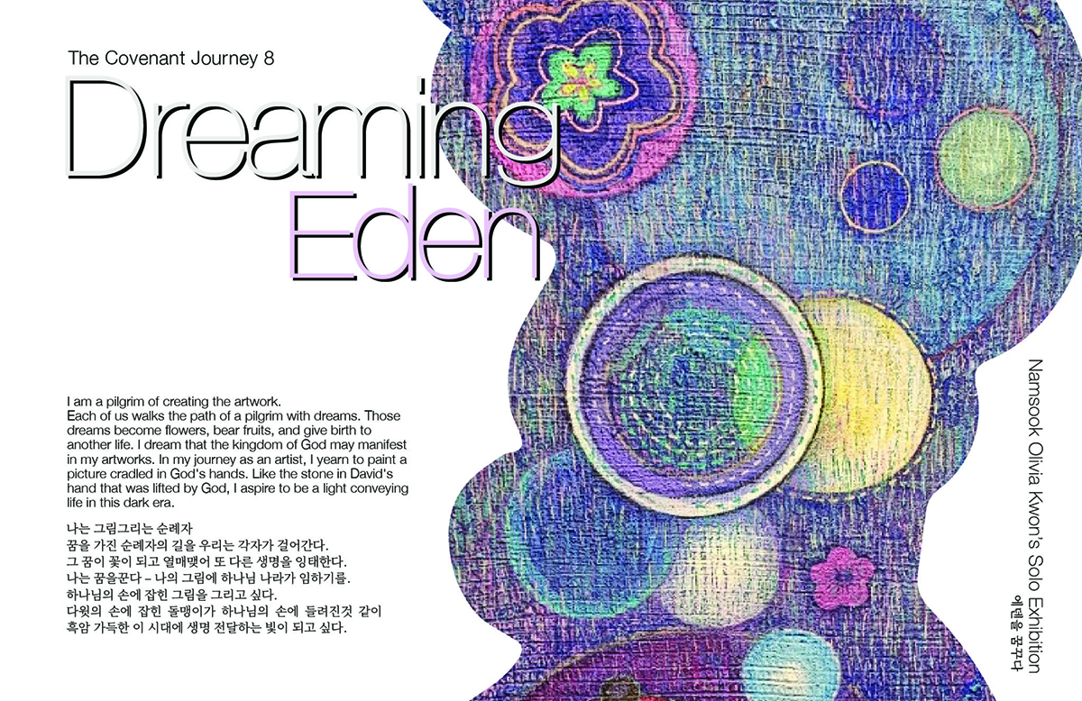 As a pastor’s wife and an artist, Namsook confidently intertwines her faith and artistry. She envisions Eden as a place where one communicates with God through words and prayers while creating art that encapsulates the journey of peace and covenant.