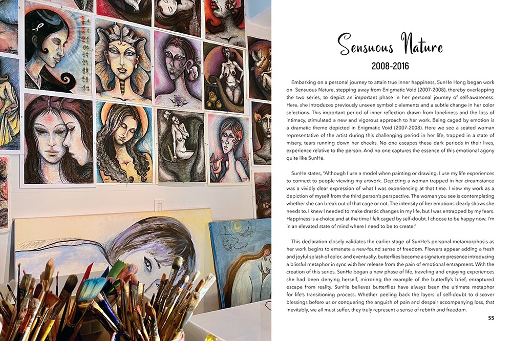 Metamorphosis: A Divine Feminine Path is Sunhe Hong’s first book. This one-of-a-kind collection consists of four themes; The Enigmatic Void (2007 – 2008), which showcases isolation through monochromatic drawings, Sensuous Nature (2012 – 2016), which captures the life cycles of inner growth and discovery, Divine Femininity (2012 – 2018), which celebrates the complexities of being female, and Metaphysical Encounter (2018-Present), composed of more recent work merging from self to interactive. Her initial process starts with a simple step of having others draw a simple line on the paper. Once the pen leaves the page, their energy is added and she incorporates their energy into her drawings further the boundary of the limitless abstract toward her work, a daring approach for an artist. This complicated, tumultuous journey unfolds with sensual vibrancy in this limited-edition compendium of Sunhe’s body of work over the last decade. Every page seamlessly expresses a distinctive, layered view of a woman’s identity reflected through her art.