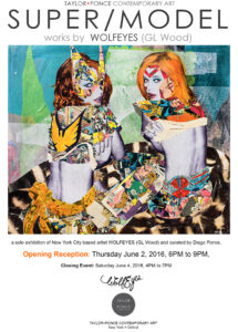 This exhibition will be on view from Thursday June 2, 2016. The reception and closing event will be held at the gallery on: Opening Reception: Thursday June 2, 2016, 6PM to 9PM, Closing Event: Saturday June 4, 2016, 4PM to 7PM “SUPER / MODEL” is inspired by comic books the artist grew up with as a child and the artist’s own photography; having worked in the fashion/celebrity world for the past 8 years. Along with watercolor, spray paint, tape, re-purposed materials, oils and acrylics, he uses them all to form a mixed media form of art.