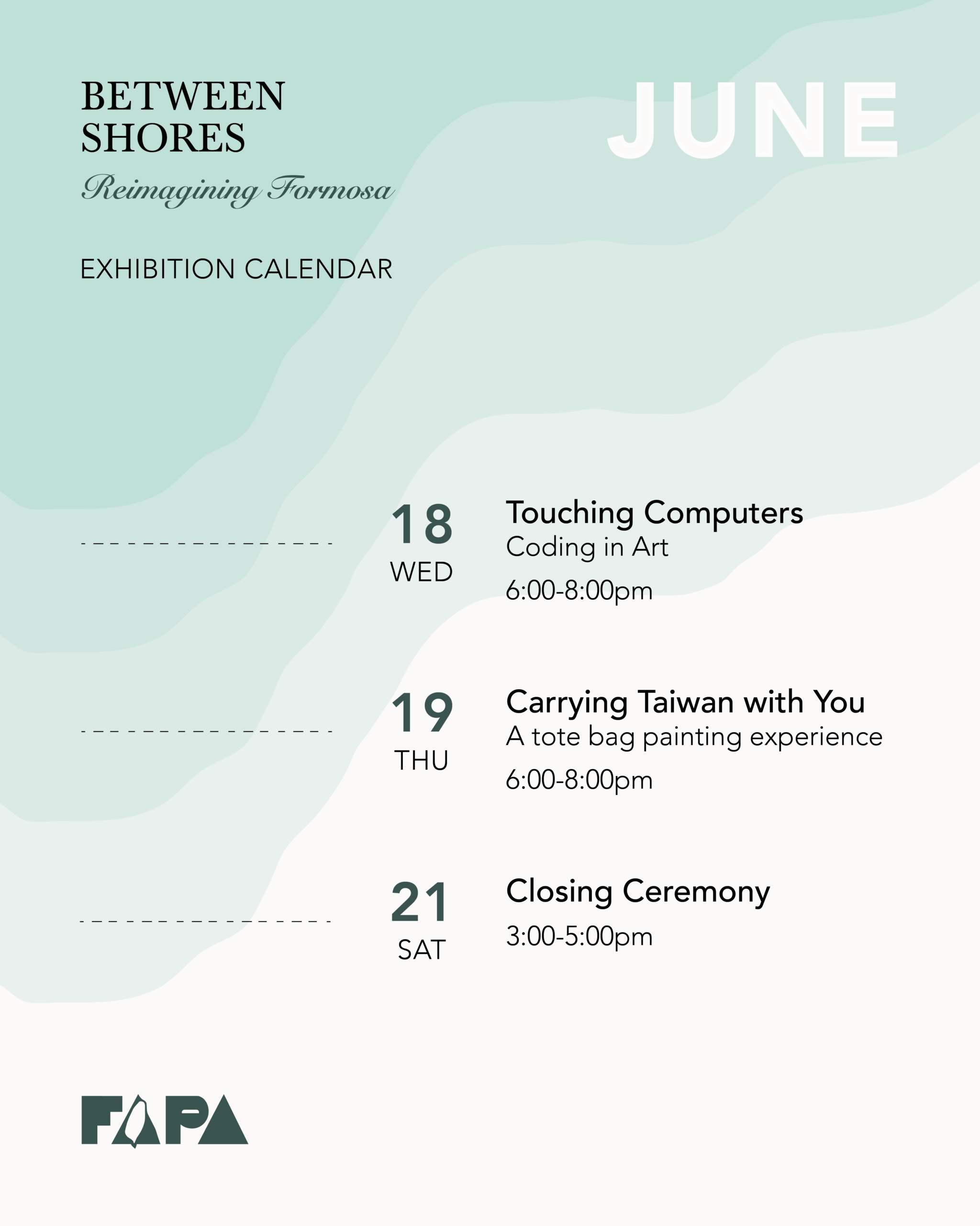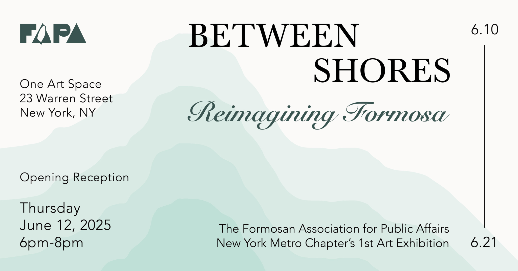 The Formosan Association for Public Affairs (FAPA) New York Metro Chapter is excited to present its first art exhibition, Between Shores: Reimagining Formosa, a group show celebrating the richness of contemporary Taiwanese art. At a time when Taiwan’s visibility in the U.S. is growing across media and political discourse, this survey examines what it means to be rooted in Taiwan while growing, evolving, and thriving in the United States.